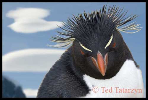 The rockhopper penguin portrait shows the wonderful head plumage of this character; his coloration gives him the appearance of yellow eyebrows. The photograph was taken in the midst of a large penguin colony. Click to view enlarged image .