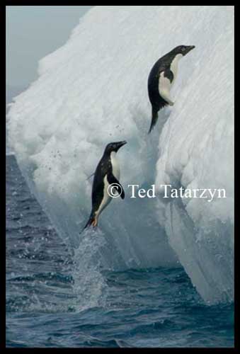 Above you see adelie penguins launching themselves seven feet out of the ocean to climb a steeply sloped iceberg. This image was photographed along the Antarctic Peninsula. Click to view enlarged image .
