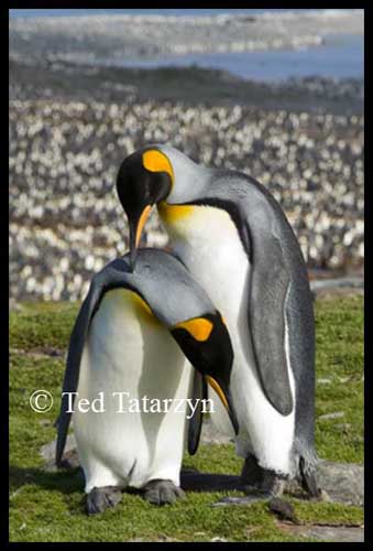 The colorful king penguins were photographed during a mating ritual on a hill overlooking the immense colony of 500,000 King Penguins at St. Andrew's Bay, South Georgia Island. Thousands of their fellow king penguins are seen in the background. Click to view enlarged image .