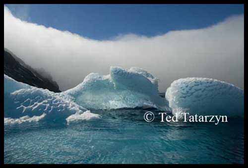 Shape, texture and color are rarely seen working together as well as when the elements of blue turquoise ice (portions like glass), pristine water, a backdrop of a fog bank, all under clear blue skies come together to form the dramatic blue icescape seen above. Click to view enlarged image .