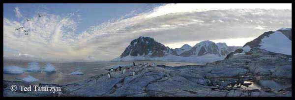 The panoramic landscape was taken of a gentoo penguin colony at 6 o'clock in the morning at Booth Island along the Antarctic Peninsula. The sun had already been up for several hours but was peeking over the peninsula mountain range while a flock of sheathbills was flying overhead. Click to view enlarged image .