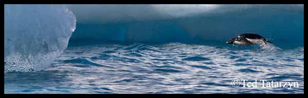An adelie penguin was caught while porpoising in the icy Antarctic waters with the sunlight glistening on her wet body. The image is filled with rich blue ice that originated from dense glacial icebergs. Ice that is blue is more dense than white ice for the air has been pressed out of it. Click to view enlarged image .
